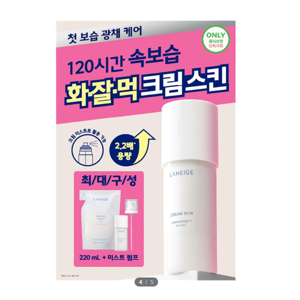 | 사용방법 | 1. 기본 사용법: 아침, 저녁 스킨 사용 단계에서 적당량을 손에 덜어 피부 속부터 채워주듯이 두드리며 흡수시켜줍니다. 2. 크림 미스트 활용: 크림 스킨 기획세트 내 미스트 펌프를 체결하여, 보습과 광채가 필요할 때마다 수시로 뿌려 흡수시켜줍니다. 3. 보습 스킨팩 활용: 크림 스킨을 화장솜에 적셔 보습 스킨팩으로 활용해보세요. |